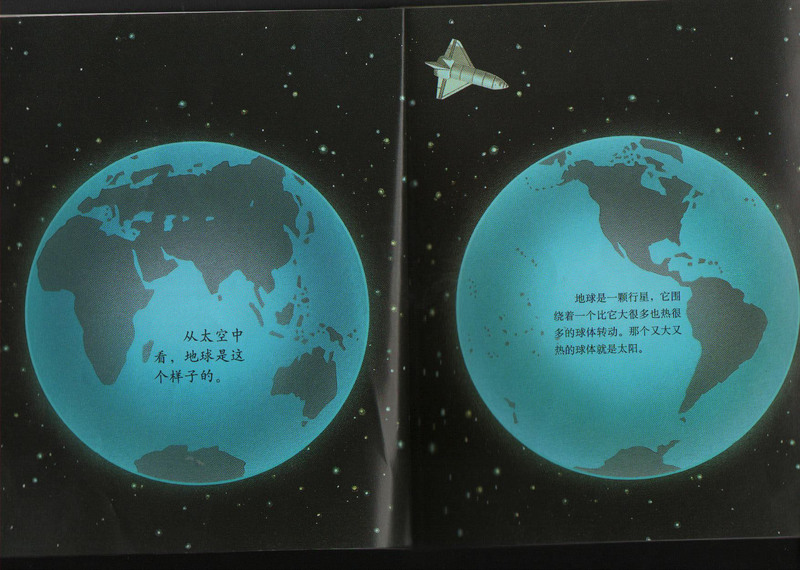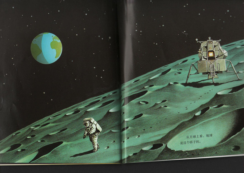 地球的地面上有平原、山峰、海洋、河流……地下河的形成、火山的喷发,我比喻说:地球就像个鸡蛋,外面是地壳、中间是地幔、里面是地核。 太阳照耀着地球,因为地球自转,还绕着太阳转,就有了白天和黑夜。我们这里是黑夜,那么地球的另一面就是白天。 离太阳近的地方就叫赤道,是全球最热的地方。南极和北极因为是地球的两端,所以非常冷。 月球绕着地球转动,月亮本身不会发光,像镜子一样反射太阳的光芒。图中有月亮反射光芒部分大小变化。 1969年名字叫“土星5 号”的火箭将送“阿波罗11号”飞船送上太空,美国人第一次登上月球。这就是当时的画面。儿子问:“怎么不是中国人?”这个问题嘛……他又问:“为什么月球上是个这样子的?”噢,他是指密密麻麻的圆坑,我说:“那是小陨星撞击月球造成的。”