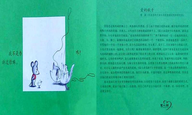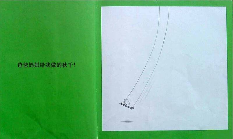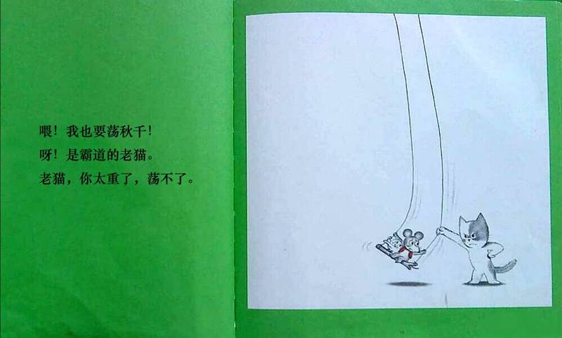 ![]() 阅读日期: 1月21日 参与人员: 妈妈和宝宝 阅读绘本: 《鼠小弟荡秋千》 绘本特色: 字很少,趣味性很强,可看图说话! 适读年龄: 2岁以上 阅读心得: 可爱顽皮的鼠小弟是我们的老朋友了,已经好久没见了,今天他带来的是一个“荡秋千”的故事。 画面上先出现的是两边绑着细长细长的绳的小树枝,一只可爱的小鸟坐在上面,它自豪又充满幸福地说:“爸爸妈妈给我做的秋千。” ![]() 大象哥哥看到小鸟玩得很开心,对小鸟说:“我也要荡秋千。”小鸟拒绝了:“你太重了。”接下来一个比一个轻的动物相继出场,马、狮子、海狮、猪,一直到最轻的鼠小弟,小鸟觉得鼠小弟很轻,应该可以玩,于是两个好朋友一起荡起了秋千。正玩得高兴,霸道的老猫看到了,把小鸟和鼠小弟都推了下去。 ![]() 我对东东说:“老猫多霸道啊!就像我们在儿童乐园玩,是不是也有和老猫一样霸道的小朋友?”东东点点头。我翻了翻白眼——就是你吧?有时他遇到想玩的倒没有像老猫那样,不过也抢过。为了维护他那小小的自尊心,我没有点破这一点,就让绘本来教育他吧!我说:“咱们可不能像老猫那样不讨人喜欢做个霸道的孩子。” 老猫坐上了秋千,鼠小弟说:“小鸟的爸爸会生气的。”老猫满不在乎。细心的读者在这里可以发现,细长的秋千绳子越来越短了。 ![]() 老猫终于发现他离地面越来越远,我问东东:“这是为什么呢?”他还真答不上来,我说:“我想到了。是小鸟的爸爸把秋千抓走了。”呵呵,接近正确答案。不过让我出乎意料的是秋千居然是绑在鸟爸爸和鸟妈发的身上的,这可真是爱的秋千啊!霸道的老猫受到了惩罚!我给孩子总结了一句:“做坏事是没有好下场的。”