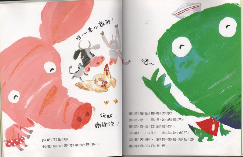 阅读日期: 1月22日 参与人员: 妈妈和宝宝 绘本特色: 这是一本讲述友情故事的优秀绘本! 适读年龄: 3-8岁 阅读心得: 忘记从那里看到这本书的书名了,我在单位一天天都在网上过,所以有的东西东看一眼、西看一眼。不过这本书的名字还是印象很深,所以虽然是繁体字,还是被我拿回来看看。 《我的朋友好好吃》是一个有趣的故事,主要以鳄鱼妞妞的心理活动为主题展开。明亮、大块童稚的色彩笔触给我们带来一股清新的风。书中有信任、怀疑、自制力、欲望这些情绪,对每个角色虽然着色不多,但生动、可爱。 故事开始的时候,反复地说鳄鱼妞妞好想吃掉她的朋友们,公鸡一家唱歌的时候,妞妞想吃掉可爱的小鸡;和小牛在一起玩的时候,妞妞想吃掉小牛;小猪和妞妞一起做甜点,妞妞想我更喜欢吃小猪;和山羊妹妹摘花的时候,妞妞想我喜欢山羊妹妹的味道;那么,这么多的诱惑,妞妞会不会吃掉她的朋友们呢?让我们继续往下瞧······ 妞妞要和朋友们去郊游了,在吃午餐的时候,大野狼出现了,大野狼的嘴巴画得比妞妞还大啊,正在危险的时候,妞妞救了朋友们,却也在朋友的面前暴露了她的本性:“他们都是我的,都是我好吃的朋友!”朋友们听到了妞妞的真话,都怀疑她,可是妞妞还是勇敢地保护了小鸡,从老鹰的爪子里救了小鸡,正当朋友以为妞妞把小鸡吃掉了的时候——妞妞用实际行动表明了自己:“虽然妞妞觉得大家很好吃,可是她绝对不会吃自己的朋友们。”选择友情还是选择朋友?妞妞用自己的行为表明了自己对友情的重视。希望东东能在这本绘本中找到友情的感悟! 本作品未经作者许可不得转载,转载请征求作者意见。擅自转载使用,将保留追究其法律责任的权利! 个性签名
