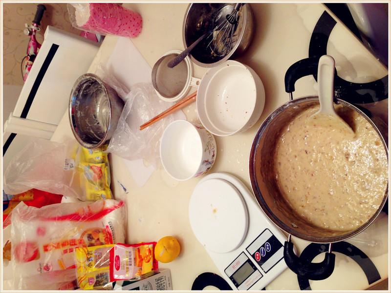 这个是我加入所有的材料,搅拌完成后的桌面,是不是很混乱,其实这样才是烘焙高手的现场啦。