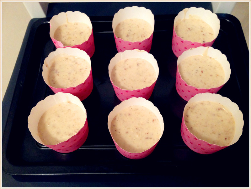 把蛋糕糊舀入纸模中,放置在烤盘上。一定记得是七分满哦。