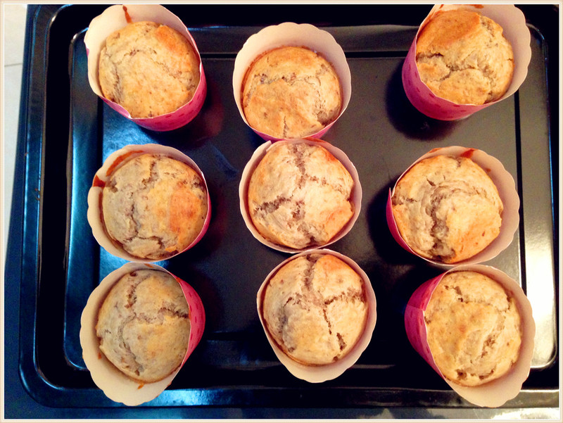 以前没有烤箱的时候,就一直盼着能早日得到。 现在有烤箱了,倒是有各种原因迟迟都没有动手做一些美食: 烘焙需要有很多的专业工具,平常的超市又都是买不到的,只能去网购,年底很忙的情况下,前天总算是淘宝来了一大箱子的工具,原料! 烘焙需要有很多实用的方子,根据难易程度,有很多很多种,对于我这样的新手,真心找个合适的,很难。这两天@考拉界的烘焙大师 指导我,总算摸出了一些门道。 烘焙需要有很多时间,特别是像我这样的新手,更是需要大把大把的闲暇。最近桐桐回老家了,而下午因外出办事我得以早点到家。 就这么天时地利人和的情况下,我要是不做出一点儿烘焙美食,就太对不起我的烤箱,对不起我的师傅,对不起我买来的那么多工具了吧! 看!美食马上呈现——玛芬蛋糕 为什么选择它呢,因为小区的一个烘焙高手妈妈在QQ上远程教我了,说这个是最容易的,失败率为零!虽然之前她说饼干的失败率也为零,但我试了两次也都是失败。 可是这次,我还是选择相信她! 材料: 香蕉2根,鸡蛋2个,牛奶60克,细砂糖70克,色拉油130克,柠檬汁3克,低筋面粉200克,泡打粉3克,小苏打粉2克,核桃65克。 制作步骤: 1、将香蕉用勺子压成香蕉泥,核桃用刀切碎备用。 2、全蛋加入细砂糖用打蛋器搅拌均匀,再加入色拉油搅拌均匀。 3、加入牛奶,继续搅拌成糊状。 4、加入柠檬汁、香蕉泥、核桃碎,用硅胶刮刀切拌均匀。 5、低筋面粉、泡打粉、小苏打粉一起过筛,加入香蕉蛋糊中,用刮刀搅拌均匀。 6、用汤勺将搅拌好的蛋糕糊舀入纸模中,大约7分满。 7、烤箱预热,上下火,170度,将烤盘放入烤箱中层或中下层烘烤,30分钟左右。 这个是步骤图,很详细了哦。亲们可以学学。
