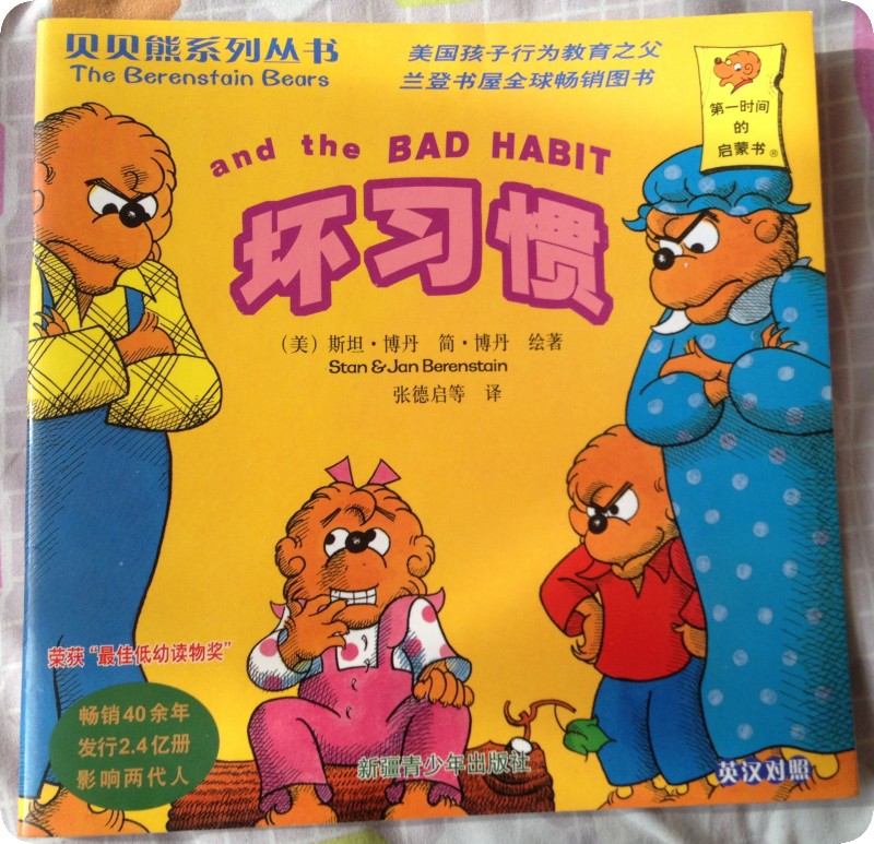 阅读日期: 1月25日 参与人员:贝贝和妈妈 阅读绘本:《坏习惯》 绘本特色:孩子有了坏习惯,需要的是帮助,而不是说教或者唠叨。 适读年龄:适合4岁以上宝宝阅读 阅读心得: 每个孩子在成长的过程中或多或少都有一些不良的行为习惯,比如吃手(不是婴儿阶段的吃手)、咬指甲、抠鼻子需要安慰物等等,当大人们看到孩子的这些不良行为时,一般都是比较生气,对孩子进行训斥、甚至打,以期通过这种方式让孩子改掉这个毛病,但是,对于孩子来说,为什么会有这些毛病呢?《贝贝熊系列从书》之《坏习惯》讲述了小熊妹妹有咬指甲的坏习惯,经常将自己的手指咬的光秃秃的,会疼。熊妈妈为了制止小熊妹妹的这个行为,给她的手指缠上了胶布,这样,确实制止了小熊妹妹咬指甲,可是带来了一系列做事情的不方便,而且还引起了其他同学的嘲笑,小熊妹妹自然最后不愿意让缠胶布了,咬指甲的毛病就一直延续。熊妈妈没有办法,请教了爷爷奶奶,于是,有了新办法,每天早上给小熊妹妹十分钱,咬一次指甲就要拿走一分钱,而咬的次数低于10次,剩余的钱就归她了。这个办法还真是灵,小熊妹妹逐渐改掉了咬指甲的毛病,长齐了一手漂亮的指甲。 方法真的很重要,否则不但伤害孩子的自尊心,还起不到应有的作用。其实,好多孩子的一些不良习惯都是因为紧张引起的,家长的过度训斥和唠叨,反而不利于孩子改掉不良习惯。贝贝在刚上幼儿园时就有吃手的毛病,一段时间后改正了,然而随着升班,到了中班一开始又开始吃手,也是过了一段时间才好,就是换了新老师紧张所致。他们班还有一个小女孩,她妈妈说每次升班的那一个月,孩子都会尿路感染一次,也是紧张导致的吧。 ~end~ 本作品未经作者许可不得转载,转载请征求作者意见。擅自转载使用,将保留追究其法律责任的权利! 评分记录