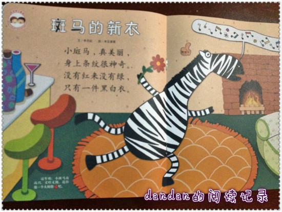 ![]() 阅读日期:1月28日 参与人员:妈妈和宝宝 阅读绘本:《婴儿画报:斑马的新衣》 绘本特色:过年穿新衣,认识斑马 适合年龄:2~3 阅读心得: ![]() 年越来越近了~~~~我们今天下午开始放假咯~~~! 这期婴儿画报也很应景,说的是小斑马穿新衣的故事。 话说小斑马的身上只有黑白两色,特别的单调。快过年了,小斑马看其他小伙伴们都有新衣服穿,心里有点儿难过和失落。 不过,伙伴们看出了小斑马的心思。 这不,小狗送上了一件黄色外套。小狐狸送上了一条红色长裤。 小斑马穿上后可高兴了~~~还弄了一顶蓝色的帽子戴。 过年了,几个小伙伴聚在一起,穿着新衣欢度新年! 故事里还配合贴贴纸,可以让小朋友们帮助小斑马贴上袜子、帽子等等。 之后还有一页介绍小斑马的科普图,还有一只纸制的立体斑马头。 黑白条纹的斑马,是非常有特点的一种动物,即便对于不能分辨颜色的小朋友来说,记住斑马的这个特点也一定不是难事。 今年又恰好是马年,学习认识小斑马也很应景哈! 本作品未经作者许可不得转载,转载请征求作者意见。擅自转载使用,将保留追究其法律责任的权利! 个性签名