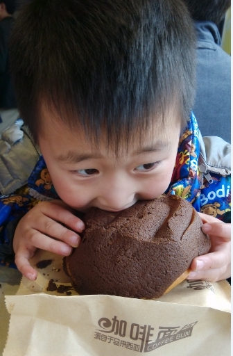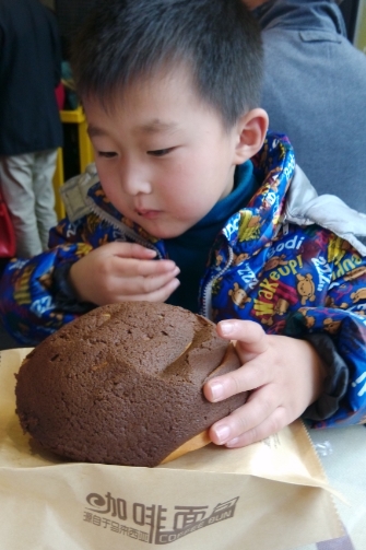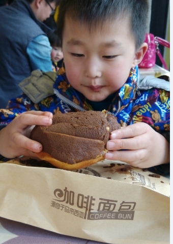 过了半个小时,我们就去拿面包,总算是有面包吃了,点点拿着面包就要吃起来,吃的是巧克力面包,妈妈吃的是咖啡面包,这个面包和平时吃的面包确实不一样,在面包的上面有一层松脆的巧克力或者咖啡,一边吃到面包,就可以吃到上面的巧克力,味道很不错哦,因为松脆,点点吃的时候面包上的巧克力都掉下来了,确实是很松脆的。
