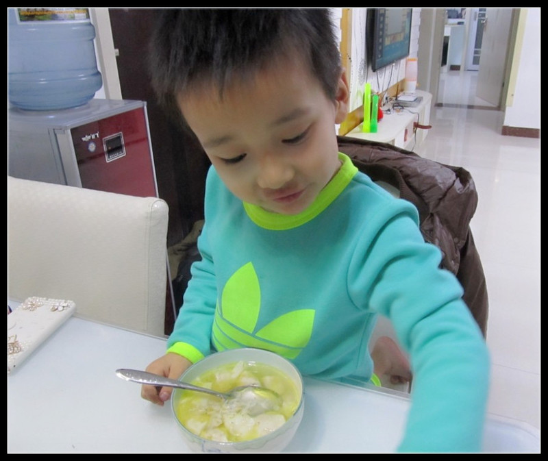 最后把馄饨放入儿子的清汤中,恩,鸡汤馄饨OK了。老公的水饺单独放盘的,鸡汤也是单独一碗,这爷们喜欢这个样子吃。最后从冰箱里拿出老公昨天炒的虫子和红烧肉,叫这爷俩来吃饭,看着这爷俩目瞪口呆的样子,我就觉得特可乐。Aric边吃边夸奖“妈妈的鸡汤馄饨真香啊,明天还想吃。”我点点头。老公问我:“你吃什么?”我才想起来,我忘记给自己准备饭菜了,哎,算了,自己再去下点黑芝麻汤圆好了。