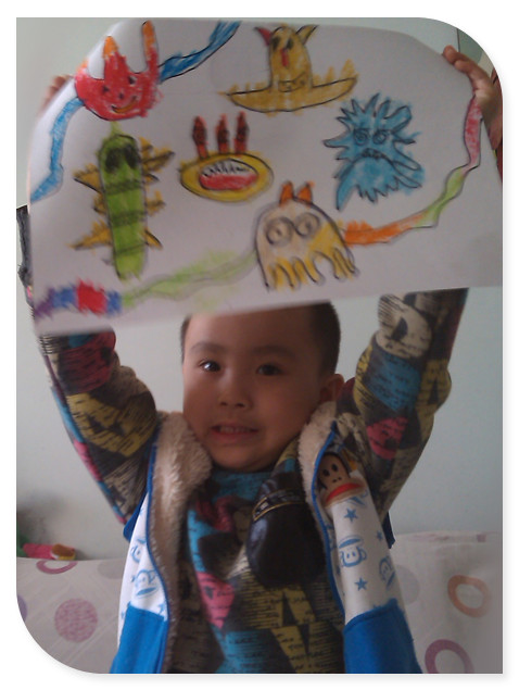 画怪物的过程,谦有说有画的,偶尔还学学怪物的声音、动作,以及给怪物安排各种强大的本领。总的说来很开心。怪物画完之后谦说要画鞭炮,说是小怪物们也过年了,想法不错,就是鞭炮画的不太像啊,凑合了。