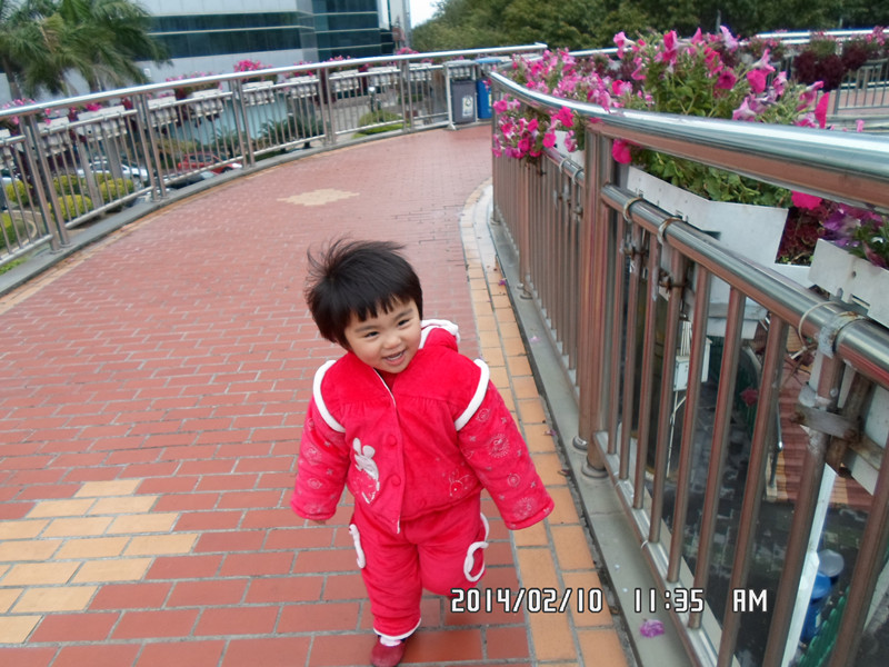 初九那天风特别的大,特别的冷,莹莹在家呆不住,一直吵着要出去玩。因此就带着她到附近去溜达溜达了。跑在天桥上可开心了。