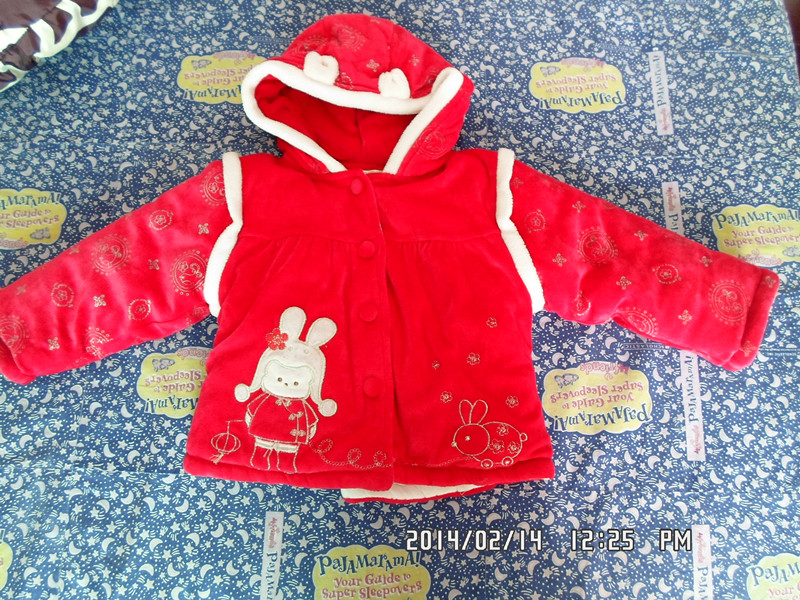 弟媳去年送的:去年显大了,今年穿着正合身。这是红色灯芯绒的上衣,带着一个帽子的,帽子是和领连在一起的,是红色系列的,春节的时候穿很有喜庆的感觉哦。可惜今年的春节天气挺热的,根本都派不上用场。帽子及袖子的边缘用那个白色绒的滚条装饰的,帽子的上方还有两个类似兔子的耳朵,显得特别的可爱,两个袖子和帽子有很多印着金色的图案,这样才不会显得太过于单调。上衣的下摆刺绣着图案,一个带着小白兔帽子的小女孩,右手上提着大红灯笼,左手拉着一条绳子 ,绳子的后面绑着一只小白兔,紧紧的跟在小女孩的后面走哦。面料是全棉的灯芯绒,钮扣也是用灯芯绒布包的扣子。还好正月初六过后天气就转冷了,刚好有穿的机会了。