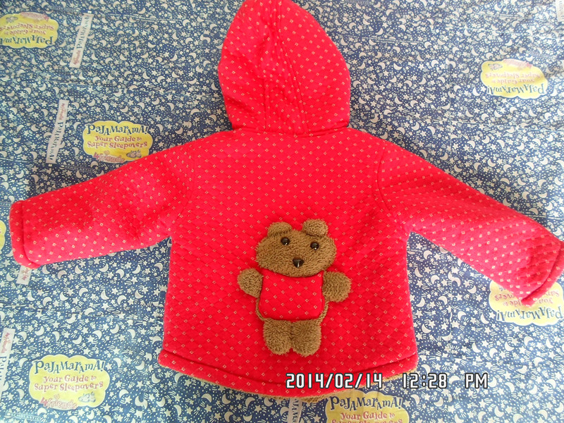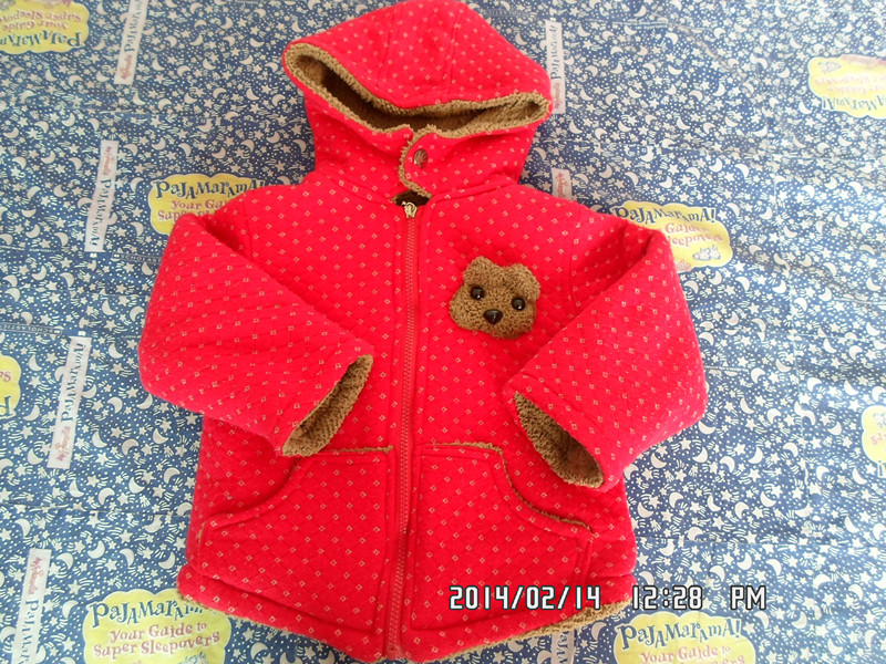 这件外套是去年我给莹莹买的,去年穿太大了,没用上派场。今年穿得刚刚好,这件衣服是件连衣帽的,也是件拉链衫。面料是纯棉的,面料摸起来很柔软舒服哦,内里是羊羔绒,中间有夹棉,前后都有可爱的小熊。袖子里也是羊羔绒的哦,袖子可以随意的挽起来。下雨天的时候厦门的天气是又冷又冻的,最初我给莹莹穿上这件衣服的时候,她一直不肯穿,说是怕怕呢,穿过一次后可爱穿了,天天要找小熊的外套穿呢。美中不足的就是会起毛,穿了两次就有点起毛了。