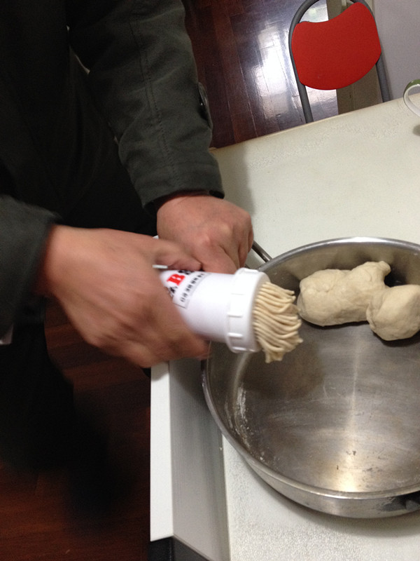 当然我不是拉面高手,做面还是需要工具的,这不,这个白色桶状神器就是用按压的作用出面。