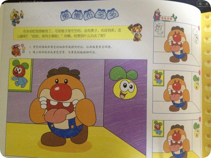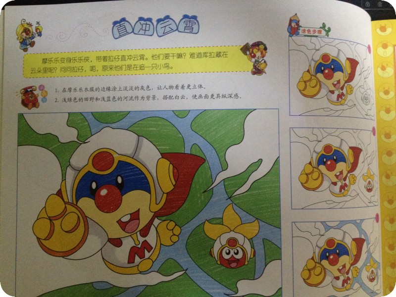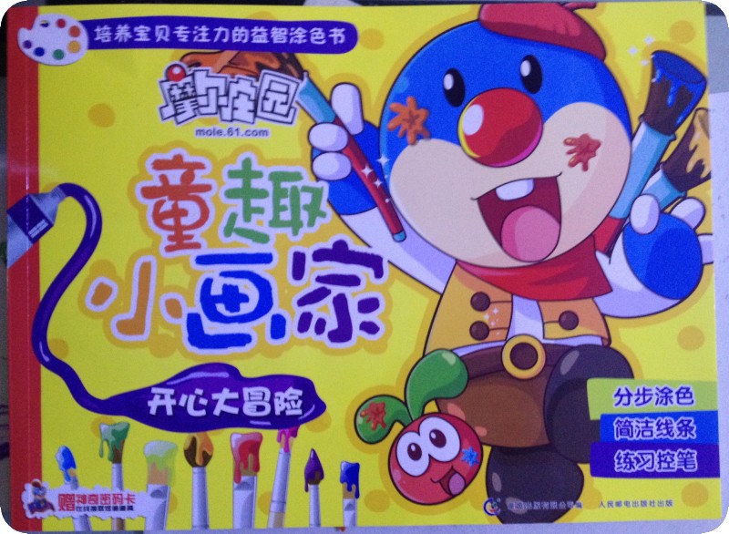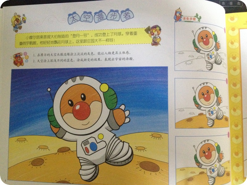 阅读日期:2月17日 参与人员:贝贝和妈妈 阅读绘本:《童趣小画家》 绘本特色:益智涂色书,教授孩子涂色技巧,使画面看起来更美! 适读年龄:适合3岁以上宝宝阅读 阅读心得: 这本《童趣小画家》是地带的元宵节活动送的礼物,没想到一回家贝贝就对这本书产生了极大的兴趣,因为我们都上班了没有人在家照顾她,所以贝爸今天带着她去上班了,她把这本书放进了包里带过去,可见多么喜欢啊。 其实这是一本涂色书,并不算是绘本,记得她两三岁时就给她买过涂色书来玩,现在都这么大了,怎么还迷呢?昨晚睡觉前贝贝让我讲这本书,好吧,那我就看看这样一本涂色书为什么吸引小家伙了。这本书是围绕着摩尔庄园里的人物展开的,至于里面所描述的情节摩尔庄园的故事有没有我就不知道了,没有看过。曾经看到小娄用粘土做过摩乐乐这个形象。