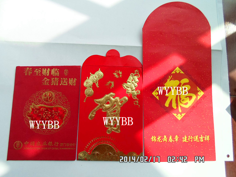 这三个红包是回老家的时候她大伯母、二伯母、还有小姑给莹莹的。那个烫金的”福”字是福到人间,写着锦龙舞春章,建行送吉祥,估计是建行回馈给新老客户的红包袋吧。还有就是一个”贺“字,但是字虽简单,寓意可不简单。一个简单的字,贺新年快乐,贺马年吉祥如意,贺健康成长,贺万事如意。。。还有一个春至财临,金猪送财,估计是猪年的时候中国农业银行回馈给新老客户的红包袋吧。