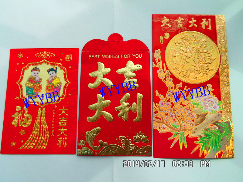 三个红包袋都有四个烫金的大字:大吉大利。莹莹收到了三个哦。最大的那个是她爸包给她的,中间那个是我包给莹的,一只鲤鱼正在往上跳跃着这个红包,鲤鱼跃龙门,这是我对孩子的期望,它不象其它红包的祝福语来得那么直接,而是用图案表达更深的情意,这也正是与众不同的地方。另外那个小的是她大姑姑包给她的红包,一对童男玉女拱起手说着:“福到人间,恭喜发财,万事顺意。”