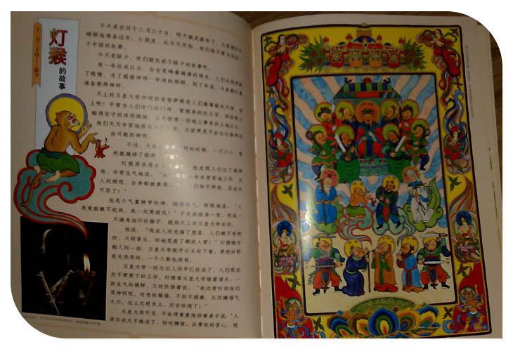 阅读日期: 2014年2月19日 参与人员:妈妈和宝宝 阅读绘本:《灯猴的故事》 绘本特色:源远流长的民间故事,经典传统的美术配图 适读年龄:适合3岁以上 阅读心得: 《灯猴的故事》是最美最美中国童话1月份的故事之一。这是一个和除夕有关系的神话故事。谦自己选的,吸引小家伙的是那一张占据一页的画面,这是一张采用民间年画中“神禡”版画形式描绘的众神图。分为上中下三层,分别是玉皇大帝坐在最上层,中间的是神仙乘云游走天庭人家,最下层是神明长期留在人家的,包括床母、土地公、灶神等。人物形态惟妙惟肖,谦看的非常认真,而且总是好奇是那一路神仙呢! 那么什么是灯猴呢?故事中的插图有个内容就是关于以前乡下用的那种油灯的图片,此乃故事中的灯猴。故事从除夕开始,辛苦一年的人们终于可以休息一下了,也准备着祭拜神明。不过,大家一不小心竟然就漏掉了祭拜“灯猴”。这让心胸狭窄的灯猴十分的不满,他跑到天上向玉皇大帝告状,说人们不种田,只知道享乐等等,听了灯猴的话后玉皇大帝也没有进行调查就下了惩罚人民的命令,要四海龙王在除夕深夜下大洪水将人全部淹死,一个不留。此事让这些在人家常驻的神仙非常的着急,他们知道灯猴这是说谎呢,于是众神商量请门神向观音菩萨求救。观音菩萨将真实情况反映给玉皇大帝后,玉皇大帝派太白金星下凡调查。结果太白金星证实了灯猴说的都是谎话,而当时的人知道了自己的灾难后合家团坐,穿最好的衣裳,吃最美味的食物等死呢!当玉皇大帝了解实情后取消了对人类的惩罚,大家平安了,于是初一的时候就有了拜年恭喜的传统,这也是亲切民俗的由来。 本作品未经作者许可不得转载,转载请征求作者意见。擅自转载使用,将保留追究其法律责任的权利! 评分记录