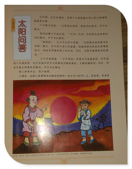 阅读日期: 2014年2月20日 参与人员:妈妈和宝宝 阅读绘本:《太阳问答》 绘本特色:源远流长的民间故事,经典传统的美术配图 适读年龄:适合3岁以上 阅读心得: 《太阳问答》是最美最美中国童话1月份的故事之一。这是两个小朋友关于太阳大小的争论。一个小朋友个子较大,他说太阳刚出来的时候离我们比较近,中午比较远。矮个子小朋友说出了相反的意见,他说太阳刚出来的时候离我们比较远,中午的时候才近的!辩论继续着,大个子说太阳刚出来像马车车轮一样大,中午的时候想小瓦盆,这就是因为近的东西看起来比较大的缘故。小个子的理由则是早晨太阳冷飕飕,中午热的人汗流浃背,这不是因为太阳离我们越来越近才越来越热吗?就这样争来争去也没个结果。