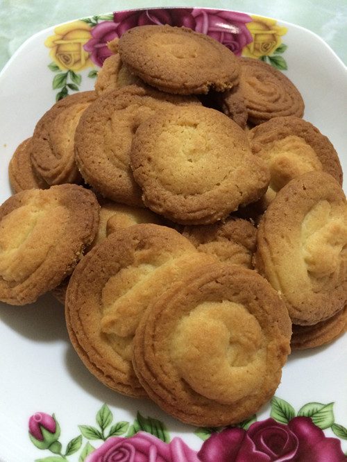 ![]() 自己尝试着做了小饼干,很是不错,虽然小饼干的颜色不是很好,但是却受到了美妞幼儿园小朋友的好评。弄得心痒痒的,然后家里添置了新烤箱,然后又有试读的机会中了《吃货妈妈手绘烘焙生活》。这样感觉如虎添翼了,烤箱有了,书籍也有了。 那么动手吧。做什么好呢,我一通翻,美妞拿过书《吃货妈妈手绘烘焙生活》,一顿翻。我要做戚风面包,美妞却要做曲奇饼干。跟美妞石头剪刀布,妈妈输了,那么做曲奇饼干吧。 妈妈动手准备材料去了,美妞呢? 原料:黄油120g,糖粉50g,淡奶油100g,低粉180g,一个花嘴,一个裱花袋。 步骤:1,黄油120g,室温软化,为了软化开,我给切成了小块。 2,按压黄油,一按一个坑,说明软化好了,就可以打发黄油,用打蛋器,轻柔的的一圈又一圈,黄油的颜色开始慢慢变淡,到最后越来越淡。 3,加入50g糖粉,搅拌, 4,加入淡奶油100g,继续搅拌,一定要一步一加,每次都要搅拌均匀。 5,过筛180g低粉,(我是把筛子直接放到盆上,然后看电子称的克数),然后搅拌均匀,此时要是还用打蛋器就不可以了。我是直接上手了,弄得满手都是,才知道,为什么吃货妈妈里,一个劲强调要有刮刀的作用。刮刀一定要买。 6,拿出裱花袋,在最下方口的地方剪出一个口,放入花嘴,然后把刚刚和好的面糊,放入裱花袋中,由于没有刮刀用的是勺子,感觉也还挺管用。 ![]() 初步完成,一切顺利,就是搅拌的过程,有些累人啊,尤其是在打发黄油那个步骤,好累胳膊。 这时美妞来了,告诉我,为了表达妈妈为她做曲奇饼干,特意给我画了一幅画。自己亲手做的。 ![]() 这个好像没有什么新意啊?就听美妞告诉我,妈妈看见了这个框了吗,我是用胶带一点一点粘的,怎么样有创意吧。对了,怪不得,妈妈看着那里不一样了呢,原来是有了框,很有创意。 美妞很想参与,可惜妈妈也是头一弄,还没有找到门道呢,这个挤的过程,还是妈妈先来,下次你在试试。 在烤箱盘上,铺上锡纸,挤出曲奇的形状。由于在烤制的过程,曲奇会变大,所以不能一个挨着一个,要有适当的空隙。 ![]() 然后送入烤箱,上下烤,180度,20分钟。 第一次做,有些紧张,坐在旁边,观看,生怕糊了。美妞一旁也跟着看着,然后不久之后,曲奇饼干的香味,开始传出,弄得我都开始遐想了。 ![]() 20分钟后的曲奇饼干。颜色均匀,香味扑鼻。就是形状太一般。 第一个试吃的人,永远是迫不及待的。那就是我的心肝肺美妞,无论妈妈做成什么样,都是不住的点头,不住的夸,我的妈妈是世界上最好的妈妈,做的东西都是最好吃的。 有些羞愧,不过真是好吃,跟蛋糕店的比,就是形状差些,其他的感觉比上不足比下有余。呵呵。 ![]()