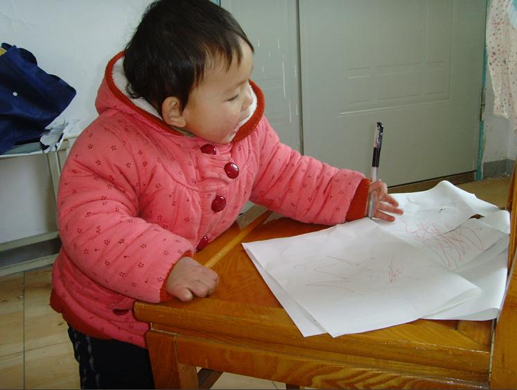 宝宝14个月的时候第一次接触笔和纸,那一天宝宝看到我在写东西,就很好奇,不过没有敢给她,怕她不小心伤了自己,可是宝宝看到不给她就大叫,真是让人受不了,公公看到了就拿给宝宝了,说他看着没事的。