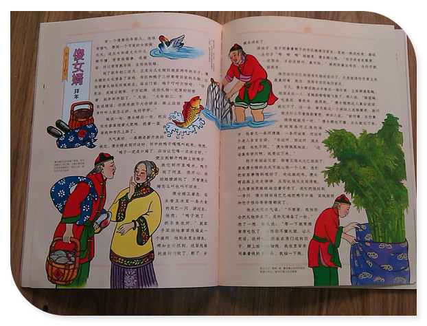 阅读日期: 2014年2月25日 参与人员:妈妈和宝宝 阅读绘本:《傻女婿拜年》 绘本特色:源远流长的民间故事,经典传统的美术配图 适读年龄:适合3岁以上 阅读心得: 《傻女婿拜年》是最美最美中国童话1月份的故事之一。这个故事超级有趣啊,同时也验证了一句民间谚语“傻人有傻福”。还是和新年有关的故事,时间来到大年初二,这是一个媳妇回娘家的日子,即便现在也是如此的。这是一个有些憨傻的年轻人,可是却有福气的娶到了一个可爱的女孩做老婆。先看故事插图,中国味道十足,年味也十足。尤其是那个占据半页篇幅的插图非常的有看头啊,这是描述傻女婿在餐桌闹笑话的情景呢,看他的脚上竟然拴着绳子,而一直公鸡正在捣乱。就连悬挂的灯笼上面都有八仙的图案,柱子上的那句“世事让三分天地宽”更见中国人的处世态度。