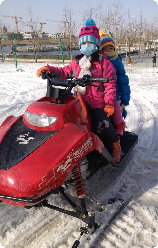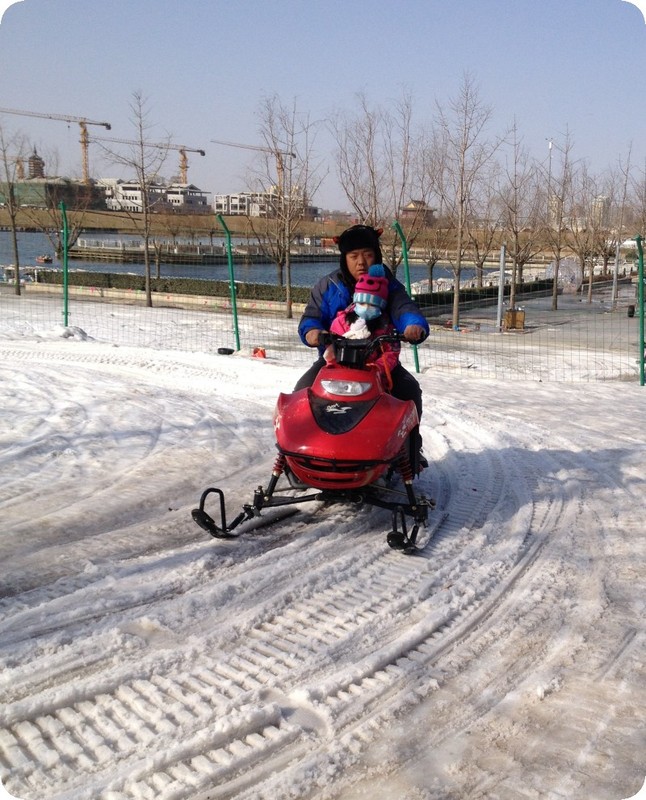 一个小时的时间到了,其实还可以用另外的票继续租用雪圈的,不过孩子们都不玩也就放弃了,真是亏啊。票里面还包含悠悠球,可因为风大的关系,根本没人管理,看到悠悠球都绑在一起。还有香蕉船,可看到场地里是雪地摩托呢,问了下才知道,香蕉船坏了,所以改为雪地摩托,虽有些遗憾,但还是体验一下吧,让人家工作人员带着贝贝饶了几圈。