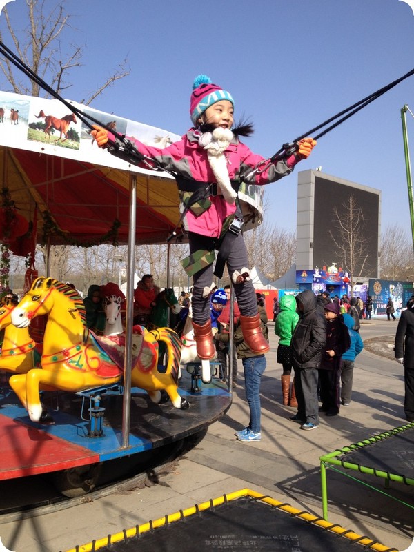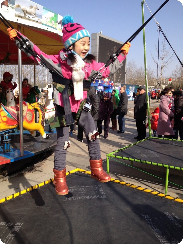 除了冰雪节之外,公园里也有所谓的庙会,但真的就没有什么意思了,除了卖东西就是卖东西,贝爸好不容易说想吃臭豆腐,去买了,结果被告知机器坏了做不了,哈哈,被我们耻笑半天。贝贝喜欢玩蹦极,从两岁就开始玩,所以在这里看到非要玩一下,30元一次,想起我带她回老家,每天去玩啊,5元一次,真是超级便宜呢。