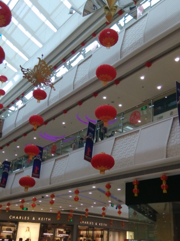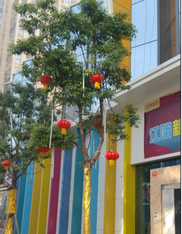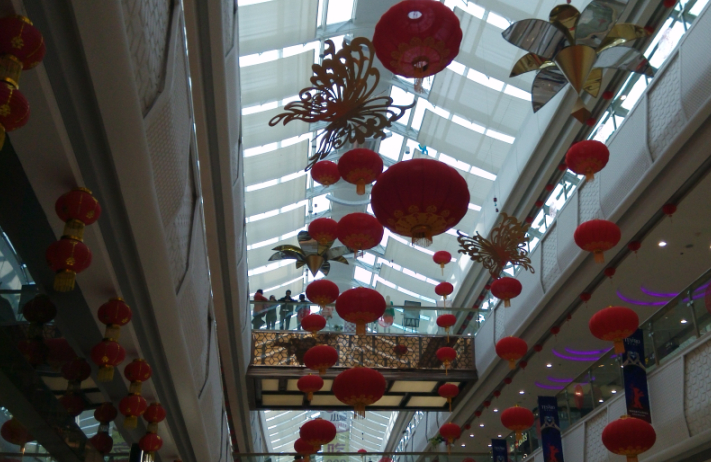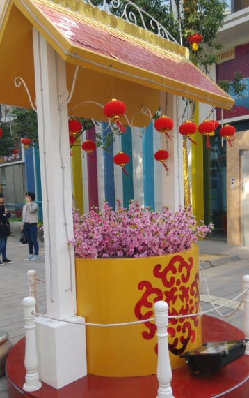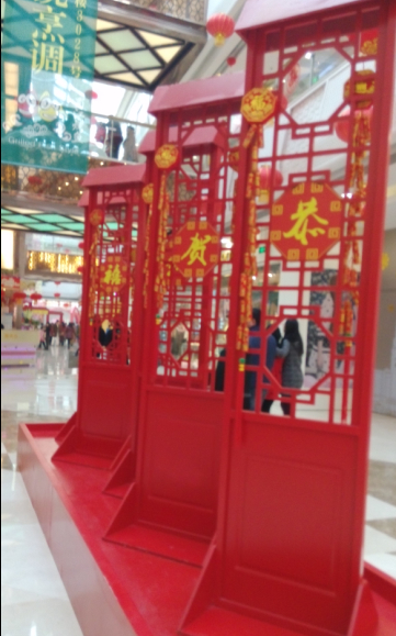 买完鞋子,我们就去另外一边的衣服店看看,这边的新年的氛围很浓郁哦,到处挂着红彤彤的中国结,挂满了红红的灯笼,还有一个梅花树,上面都写满了春节的祝福,还有一排恭贺新禧的门,是不是很喜庆呢?