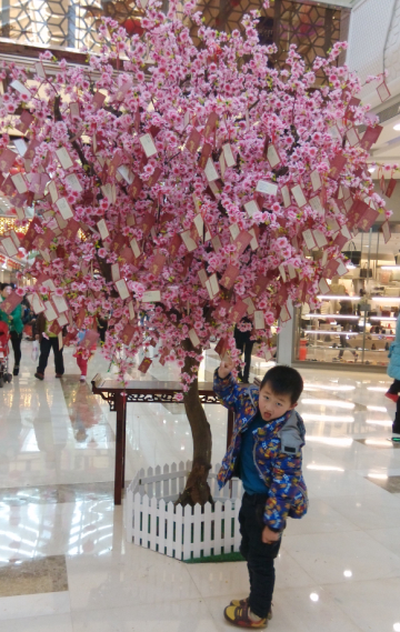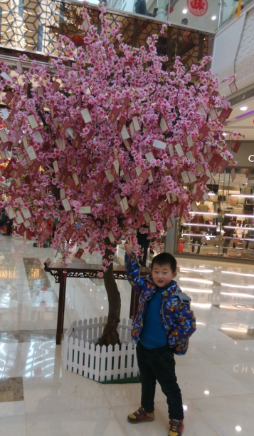 新年新气象,真的很有年味呢。这几天去万达逛街的时候,这些东西都还在呢,点点又去看梅花那边的祝福语,很好玩呢。