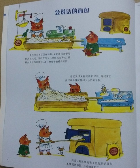 阅读日期:3月2日 参与人员:轩轩和妈妈 阅读绘本:《会说话的面包》 绘本特色:有趣的创意故事 适读年龄: 3岁以上 阅读心得 凯瑞斯的《最受欢迎的故事》,乱乱的画面,奇特的造型,可故事内容却非常有创意,宝贝很喜欢的一套绘本。 想知道面包为什么会说话吗?哈布丁和嘭嘭正在和面做面包,哈布丁的女儿哈妮抱着会说话的布娃娃在旁边高兴地看着爸爸做面包。他们把揉好的面做成各种面包,做好后放进了烤箱,当哈布丁把烤好的面包从烤箱里拿出来时,突然最后拿出来的面包发出了“妈妈”的声音。要知道面包是不可能会说话的,除非闹鬼了,这下把哈布丁吓坏了,赶紧找来了墨菲警官。当警官捡起会说话的面包时,面包又叫“妈妈”,吓得警官也摔到了和面槽里。这时,小屁孩儿和蚯蚓爬爬来到了哈布丁家,爬爬使劲往面包里钻,终于找到了面包说话的原因了,大家把面包掰开时,发现原来是哈妮的布娃娃掉进了和面槽,被做进了面包里。奇怪的事情终于弄清楚了,大家都一起来吃这个“闹鬼”的面包。 宝很好奇,一直问我,布娃娃这么大,为什么哈布丁做面包时就没发现呢?我告诉宝,可能布娃娃不是特别大,而哈布丁做的面包很大,所以就不小心把布娃娃当成肉陷给包进面包里了。宝听了哈哈大笑,说真搞笑。 本作品未经作者许可不得转载,转载请征求作者意见。擅自转载使用,将保留追究其法律责任的权利! 个性签名