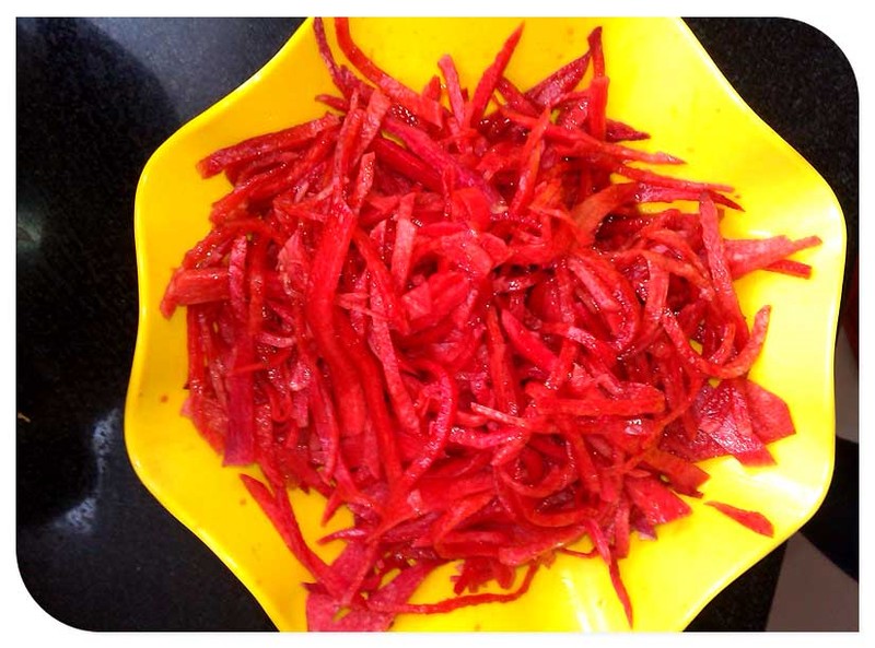 我家爱吃的凉菜之一——酸甜心里美:这是一道以萝卜为主要原料的凉菜。选择那种绿皮红心的萝卜切成细丝,然后加入盐杀一下水分,在放白糖和醋拌一下就可以了。绝对的简单易行吧,吃起来酸甜味道,很爽口的。