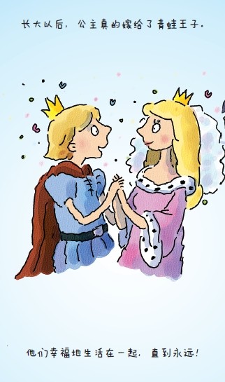 每个少女心中都有个公主梦。尤记得小时候,最喜欢做的事情就是在阳台上支个躺椅,捧着格林童话和安徒生童话,沐浴着阳光,读一个个或温暖、或浪漫、或惊险、或悲伤的故事,心情跟着故事情节起伏,当看完以后心里无比舒适。当然最喜欢的莫过于故事的结局,公主和王子从此幸福的生活在一起了!当朱老师和我们分享了小红帽以后,仿佛一下子又把我们拉回到了美好的童年,拉回到那一个个温馨的午后,而这次的试读样章是青蛙王子,就让我们陪伴那只笨笨的青蛙,去邂逅她美丽的公主吧! 文章一开始就提到了波比公主讨厌国王给她挑的未婚夫,就像讨厌一只青蛙。公主年少,掘强,对于不喜欢的人不假辞色。国王要求公主必须在规定的时间内找到合适的人选,不然就的听从自己的安排。图画中的丁克王子确实长着一张不讨人喜欢的长脸,而国王更是形象,大肚子鼓鼓的,可爱极了,皇后一看就是一个温柔贤惠的人,而公主生气的模样栩栩如生,小盆友一看到就能自己理解了。波比公主去院子里玩,脚下一个没注意,一下子把自己心爱的金球掉进池塘里了,而自己也是摔的非常的狼狈。这时青蛙王子出场了,此时王子还是一只丑丑的青蛙,他答应帮助公主找到金球,但是作为条件,他要求公主和他同吃同睡。公主一口答应,但是拿到金球后就逃离了。青蛙一直追公主到餐桌上,并把这件事情告诉了国王,国王要求公主履行承诺、说到做到,这里也为后面的故事买下了伏笔。青蛙并不受公主的欢迎,公主一把把它扔出了房间。当做完这个动作以后,公主突然意识到自己行为多么的错误可恶,她捧起青蛙,亲了亲他,然后青蛙变成了一个英俊的王子。此时,王子对公主求婚了,公主也要求国王说到做到,和前面的情节遥相呼应。最后,也是我最喜欢的一句话,他们幸福的生活在一起,直到永远。 其实青蛙王子的故事主要体现的就是诚信。一个人不管做什么事情都要讲求诚信,说到就要做到,所以在给孩子树立这种观念的时候我们大人首先就要以身作则,答应的事情就要做到,做不到的不胡乱答应,这样才能在生活中更加正确的引导孩子。有绘本的指引,有生活的引导才能让孩子更深刻的体会诚信!有时我和老公答应给大皓同学一个奖励,如果说好奖励的东西具体是什么的话,不论如何,我们都会完成我们自己的承诺。文中波比公主虽然任性,但是最后把青蛙摔出去以后,马上能意识到自己的错误,并改正,她的内心深处还是非常善良的,而这种善良的形象也会深深的影响到孩子。其实生活中,我们一直在教育孩子要做一个正直、善良的人,有时单单的喊口号,并不如讲个故事更能简单形象的让孩子们理解!故事还有一个主题就是不要只单单的看事物的表面,也要透过现象看到本质,就像“我是一只小青蛙”的歌词里唱的:有天遇到我的小天鹅,千万别笑我是癞蛤蟆,青蛙一定也能变王子,和她一起来跳恰恰恰!这是一种善良的蜕变,有时我们双眼看到的事情,并不是事物的本质,而不管什么样子的人,总会有优点,有他好的一面! 重新编定的《重读经典影响孩子一生的童话绘本》,首先在封面上采用绿色,一下子给人一种生机勃勃的感觉。就像介绍里所说这是经典童话遇上大师绘本、神奇文字与斑斓色彩的完美结合,经久不衰的经典形象不仅仅影响到我们这一代,还能对我们的宝贝起到指引作用。同时这也是一部高大上的绘本,厚重的感觉、精美的文字,都值得我们收藏,重温也好,讲给孩子们听也好,都是不二之选! 最后附上皓皓爸爸的青蛙王子的故事:从前有个丑不拉几的姑娘,长达后变成了一只青蛙,被英俊的大皓吻了一下,变成了美丽的妈妈!老公在我给大皓讲故事的时候,自己给大皓编的,逗得大皓哈哈大笑!而我就成了受害人!博大家一笑~~