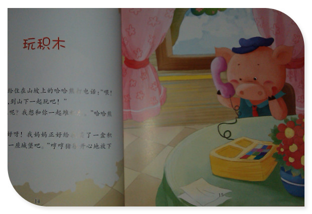 阅读日期: 2014年3月7日 参与人员:妈妈和宝宝 阅读绘本:《玩积木》 绘本特色:谭旭东纯美亲子阅读系列,通过故事来让孩子了解关于重力的现象 适读年龄:适合3-6岁 阅读心得 《玩积木》是谭旭东纯美亲子阅读系列中的一个故事。故事是从玩积木开始的,最开始讲的时候以为是积木会拼搭出特别的作品呢,实际搭积木只是故事的一个引子而已。哼哼猪打电话邀请哈哈熊一起玩堆积木,树林里空地上哈哈熊、顺风耳兔、万能鼻狗一起堆积木呢,不过没多久就都没了耐心,哼哼猪玩起来剪刀和纸,顺风耳兔想去拔点萝卜吃然后就钻进森林找菜地去了。哼哼猪开始恶作剧的往天上扔纸片,没想到纸片在空中慢慢飘着,哈哈熊觉得有点奇怪啊,他发现是因为纸片轻所以落的慢。