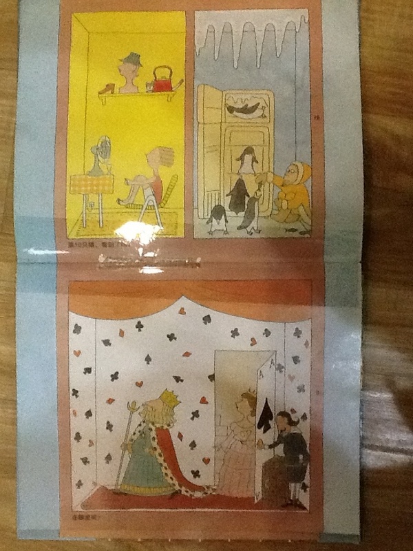 九楼有国王和王后,还有红桃,黑桃,方块,草花,这是什么地方啊,是演员还是大牌的地方呢,点点说是打牌的地方,小猫躲在国王的披风里面。十楼一边是饼屋,里面有企鹅,一边是夏天,还吹着电风扇,小猫躲在哪里呢,在小包的后面哦。
