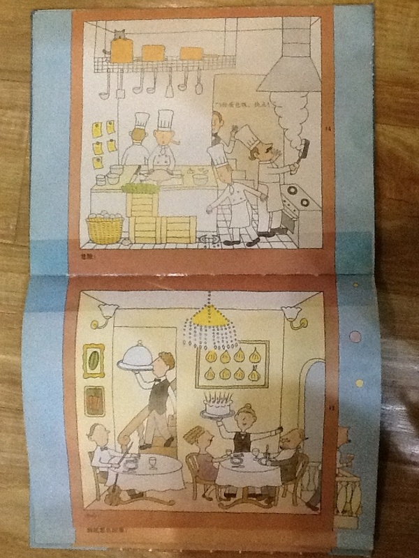 十三楼和十四楼是一个餐馆,人们在用饭,找到小猫了,就在顶上呢。餐厅里面的人们都很忙,还不小心摔坏了盘子。