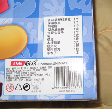 ![]() 话说这迪斯尼文具盒套装还是前年儿童节时,老公的上司送的,记得人家是专门去商场买的,好像是200多呢,现在淘宝上才不到90了,还好不是我们自己出钱,否则又要心痛了,呵呵。 ![]() 遗忘家里杂物实在有点多,这文具盒又还比较大,原来有次收拾家里时被老公放在柜子的最上面去了,也就没管它了,这还是因为罐罐上学了,要用文具盒了,才想起来,赶紧取下来看,还好外面还有塑料袋包装好的,直接拿出来就可以用了。 ![]() 看这外包装,很大一盒吧,送人是很不错的,还有粉色的,米妮的,当然就是女孩子用的,罐罐肯定就是蓝色的了,米奇的 ![]() 盒子后面还有很详细的清单呢,里面有些什么东西呢 ![]() 保温水壶一个,打开闻了一下,没异味,看说明书应该可以保几个小时的温吧 ![]() 三支铅笔和两支圆珠笔,12色的彩色蜡笔 ![]() 两个米奇头夹子,一块大的橡皮擦,一本标签本,一个完全没有刀口的不松手的手工剪刀一块直尺 ![]() 米奇的卷笔刀 ![]() 米奇的塑料文具盒,两面都可以打开的,有面还有专门放铅笔的 ![]() 正好这个文具盒可以给罐罐用了,其它的都已经从盒子拿出来了,和其它的文具放在一起来了,也就不要外包装了,免得太占地方了。 本作品未经作者许可不得转载,转载请征求作者意见。擅自转载使用,将保留追究其法律责任的权利!