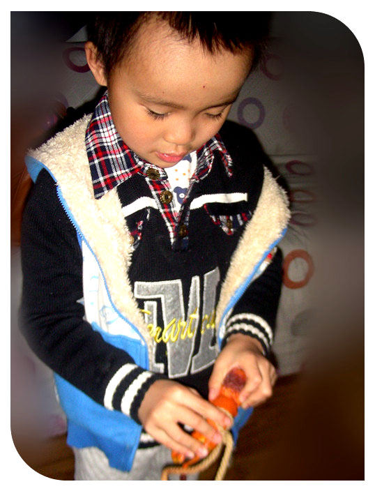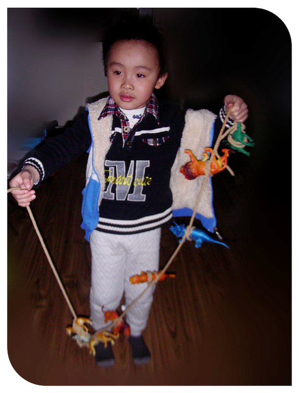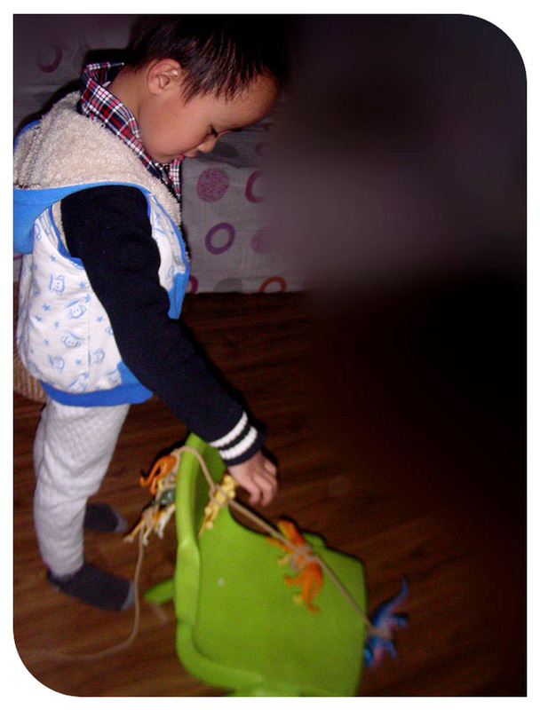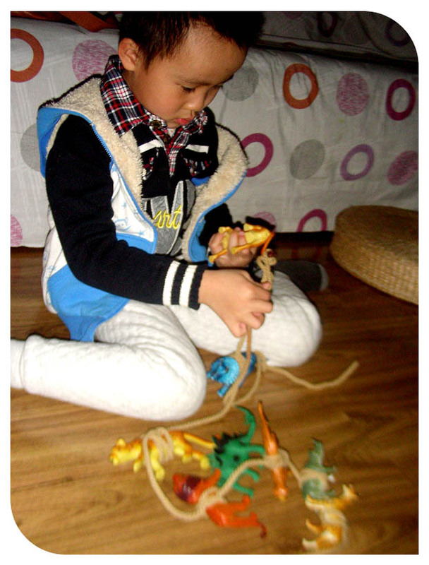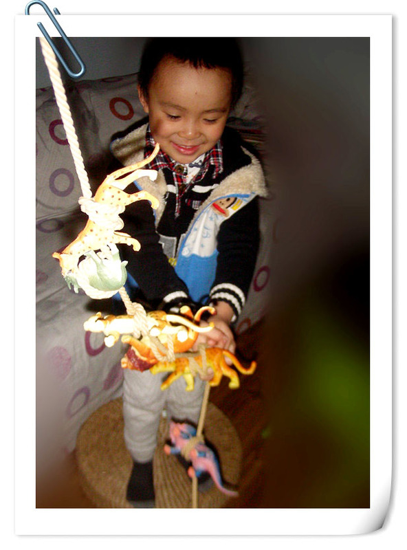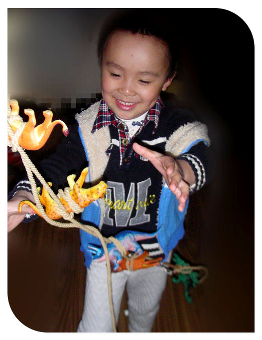 还是上学前的事情了,发生在宝贝寒假里,记录小家伙一次有意识的玩耍。看了《少年派的奇幻漂流》之后小家伙对绳子的兴趣更加的足了起来。这次自己翻出绳子又找出好多小动物恐龙之类的开始玩了起来。小家伙最初的想法非常的简单,就是想把这些小动物一个个的用绳子绑上,绑东西这事小家伙不会,可是又不看妈妈的动作就自己在哪里瞎鼓捣,看着绳子绕来绕去的好些把小动物给绑上了,实际上手一松这动物一下子就掉落了下来,根本就是没绑上啊。客厅里变得很安静,时间一点点的过去了。小家伙终于弄不好罢手了,开始喊妈妈帮忙。臭小子早跟妈妈学不至于浪费这么多时间吧!