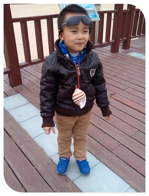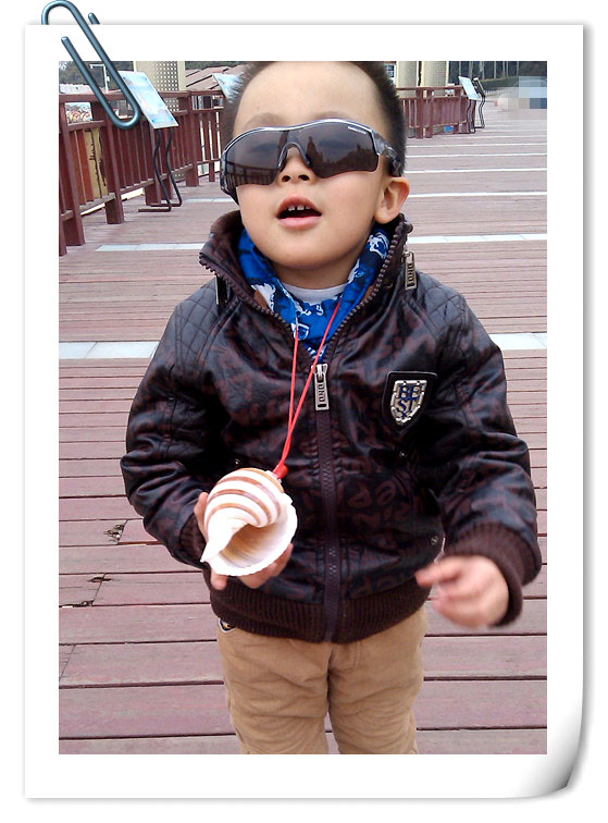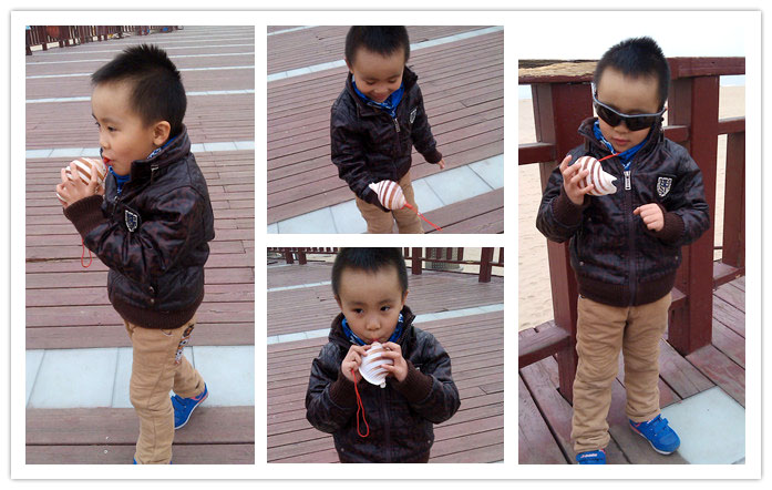 海边四周已经有了些卖这种小玩意和海边纪念品的流动车,谦一眼就看到了车上的海螺了,于是念叨着要一个。妈妈让谦和爸在一旁等着,妈妈自己去买,挑了个大个的给小家伙买了回来。远远看着谦就将海螺举起高高的晃来晃去,小家伙乐呵呵的就奔跑过来,大海螺吹的声音还挺大的。谦说找不到妈妈的时候就吹海螺,这样妈妈能听到就可以来找宝贝了,这个想法不错的!