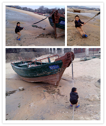 这里是停靠在沙滩上的一个东西,上面有椅子什么的。还有一个长长的杆子,杆子上还有些乱七八糟的东西不知道是干啥用的,估计和钓鱼有些关系吧。此物可是乐坏了宝贝了,顺梯子上去,挥舞着长长的杆子玩的美,还大喊爸爸来看,老爸听不见于是吹海螺呼唤之,后来还是没听到,算了,先自己玩吧!
