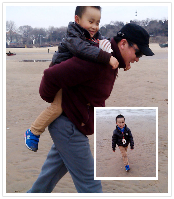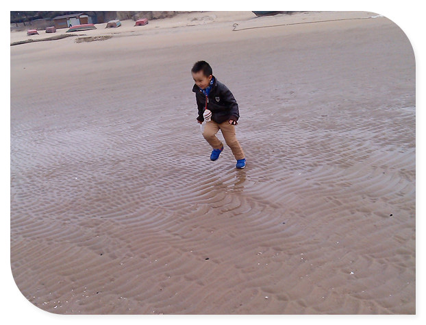 这里近处有沙滩,远处有大海,中间就是这样的说深不深、说浅不浅的带水沙滩。妈妈让谦从水少的地方走,可是小家伙磨磨蹭蹭的在后面走的慢,等妈妈已经过来的时候,臭小子还是从有水的地方跑过来的!