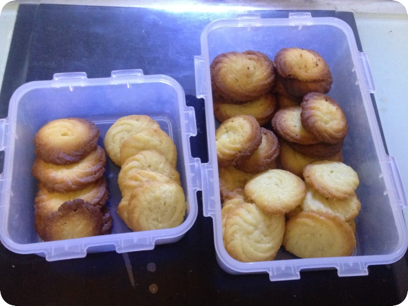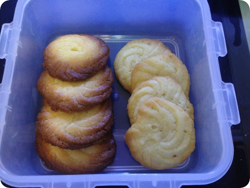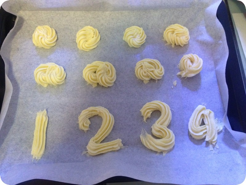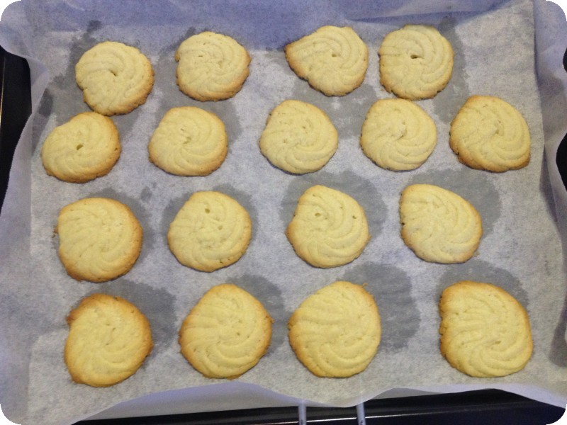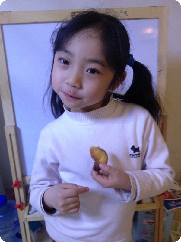 ![]() 自从在地带获得了《吃货妈妈的手绘烘焙生活》这本书,我的烘焙热情被彻底点燃起来,尤其是当你做出的食物受到大家的称赞,那种感觉真是特别好,何况俺家一直有个忠实的小吃货,每次做好的第一时间,她一定要来品尝下,然后直说好吃。这样的情景,怎能没有动力去做美食呢? 哦,对了,这本书也被两位同事借回家看了看,其中一个立刻从当当下单买了一本准备好好研究,成功推广了一本,哈。从春节前到现在一个多月的时间,我陆陆续续做了三次蛋糕卷、两次小面包、两次饼干、一次披萨,还都挺成功的。做曲奇饼干,是看到美美妈妈做了之后,果断决定尝试一下,前天晚上做的,确实非常好,做法也简单,跟大家分享一下。 ![]() 原料:黄油120g、糖粉50g、淡奶油100g、低筋面粉180g 做法:1.黄油软化之后,用手动打蛋器搅拌,会发现颜色越来越淡,而且越来越顺滑,如上图所示; 温馨提示:黄油一定要非常的软才可以,测定的办法就是用手指一按一个坑,否则搅拌时会全部粘在打蛋器上。如果性子急或者时间不够的话,可以放在微波炉或者烤箱微热一下,如果热大发了化成水了,放在冰箱冷藏一下凝固住,也是可以用的,不过肯定是自然软化的更好啦。 2.在搅拌好的黄油中加入糖粉,继续搅拌均匀; 3.将淡奶油加入,继续搅拌均匀; 4.再加入低粉,继续搅拌均匀; 都说低粉要过一下筛效果好,我犯懒买了筛子也从来没用过,搅拌的时候多用心搅拌均匀。这个搅拌很费力气,贝爸帮忙来着,哈。 5.将裱花袋中装好花嘴,把搅拌好的面糊装入裱花袋,后面空的部分卷紧,有夹子的话最好夹住,一手扶着后半部分,一手扶着花嘴上方,挤出圆形或者随意的形状,我别出心裁的挤了1、2、3、4的数字,结果除了4,三个数字都烤焦了,尤其是1,几乎成黑色了,每尝扔掉了,2也成了棕色,但是尝了下,味道还不错,没有焦了的味。 6.预热烤箱后,180度,烤20分钟。这个温度烤出来的颜色稍微有点焦,第二盘我降低了10——20度,颜色漂亮了许多,但刚烤出来的酥脆度有一点不同,放凉了口感没什么差别。 ![]() 第一盘,创意了数字,结果焦了,没好意思拍 ![]() ![]() 第二盘,降低了温度之后,颜色漂亮了很多 ![]() 这个配料做出来的饼干就是这些(贝贝吃掉了两三个),温度不同颜色不同大家就看的很明显了,昨天我给同事带了一些,让他们品尝有什么区别,他们说口感和味道都没有任何区别,很香很好吃,甜度也不大,哈哈,好开心!! 缺点:挤出来的花纹很清晰,可是烤出来之后花纹就不清晰了,这个还得继续改进,学习怎么让花纹清晰的方法。 ![]() ![]() ![]() ![]() 当天晚上的第一个试吃者,一个劲的说好吃,10点多了呀,真怕这样吃胖了, 她吃完一片之后还想吃,说“妈妈,这个3看着有点不好,我把它吃掉吧” 昨天放学回来,一会吃一片,看来很有诱惑力哦