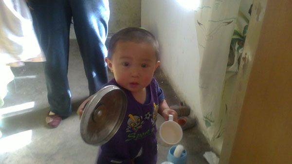 那天,秃秃自己在屋里跑着玩,姥姥站着看电视,顺便可以看着他。小家伙突然蹲地上抠那个坐开水的大壶(幸好里面水是凉的)。费劲巴拉的把大壶盖子抠出来了,拿着就跑,姥姥管他要都不给,我刚巧在他们屋门口,他直奔我就来了。伸手把那个壶盖递给我,嘴里还‘嗯嗯’的说着,意思是他要把这个盖子送给我……哈哈~~