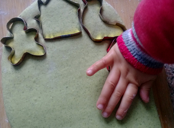 小手帮帮我把模具压到擀开的面上面去,并压一压。