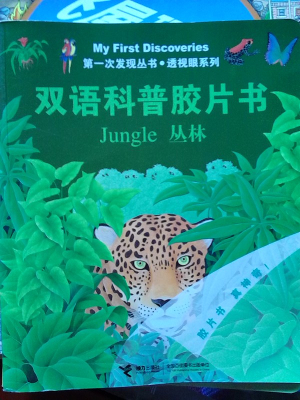 这是第一次发现系列里的丛林,也是双语的,一样是透视眼的。相比其它的几本胶片书,这本丛林的画面感非常的漂亮,郁郁葱葱的丛林里好多没见过的动物,其中有不少我发现在我上次中的那本热带雨林里有介绍,不过老实说那本书里的动物我到现在都没认全,在教小皮球的时候我只能说这是一只什么什么动物,反正她现在也不知道,等下次有空我把所有的动物不认识的都标上名字和拼音,这样就不会在教小皮球的时候露怯了。
