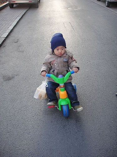 之前在二岁生日的时候,我给宝贝买奶粉赠送了一辆自行车,不过这个对宝贝来说太大了,宝贝的小脚都够不到车镫子呢,于是不久我就用积分给宝贝换了一辆小一些的车,宝贝见到后,眼里都放着光彩,当天就开始进行“锻炼”,先是练习上车,然后是坐在车上往前滑行……现在宝贝已经玩得非常熟练了,骑车技术已经非常之高了。