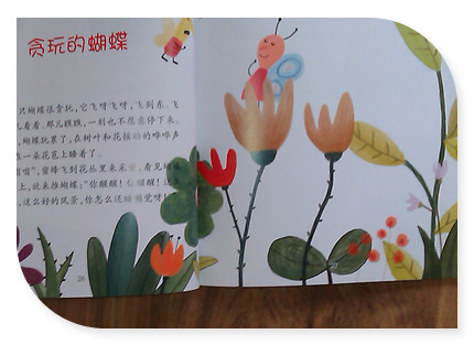 阅读日期: 2014年3月28日 参与人员:妈妈和宝宝 阅读绘本:《贪玩的蝴蝶》 绘本特色:谭旭东纯美亲子阅读系列,很应景的故事,里面有关于春色的优美文字描述,通过蝴蝶的故事不要浪费大好时光,要找到适合自己的事情。 适读年龄:适合3-6岁 阅读心得 《贪玩的蝴蝶》是谭旭东纯美亲子阅读系列中的一个故事。这是一个非常适合在春节里给宝贝阅读的一个故事,里面有关于春天的很多优美而且细腻的文字描绘,还有非常美丽的画面,有可爱蜜蜂和蝴蝶,还有生动的花草树木,给孩子营造了一个充满生机的春天,而且通过蝴蝶的感受让孩子也明白好时光不要浪费,努力也要趁早啊!