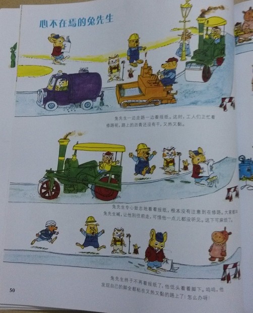 阅读日期:3月28日 参与人员:轩轩和妈妈 阅读绘本:《心不在焉的兔先生》 绘本特色:看兔子先生心不在焉的后果,告诉宝贝做事不能心不在焉 适读年龄: 3岁以上 阅读心得 兔先生一边走路一边看报,这时工人们正在忙着修路,路上的沥青还没干,可一直专心看报的兔先生根本就没有注意到在修路,大家都喊着他别往前走,可他完全没听到。最后兔先生终于不看报纸了,因为他的脚被沥青黏住了。工人拿来长杆子想把兔先生挑起,可不管用,用卡车拉也没有用,想用巨大的风扇把他吹出来,或消防员用水把他冲出来,可这些办法都没有用。最后只好请来了铲土机把兔先生挖出来。兔先生谢过大家并保证以后走路好好看路。可是,没过多久,兔先生就忘记了自己的保证,又看起报纸来了。 看到这个故事就让我想到大宝,大宝做事就是没有专注力,经常会心不在焉,包括走路有时候也和兔先生一样,所以经常会摔跤。故事讲完,我问宝,你是不是和兔先生一样,走路不看路,经常摔跤。宝听了又反驳我,说他走路没有看报纸,我说你虽然没看报纸,可是也没看路,所以才会摔跤。宝说我以后会看着路走的,不会摔跤了。我再和宝解释,兔先生因为没有看路,所以不仅黏住了自己的脚,还给很多人带来了麻烦,最后被挖烂的路工人们还要重新修好。所以我们做任何一件事都要专心一点,不能心不在焉的。但愿这个故事会让大宝稍有改变。 本作品未经作者许可不得转载,转载请征求作者意见。擅自转载使用,将保留追究其法律责任的权利! 个性签名