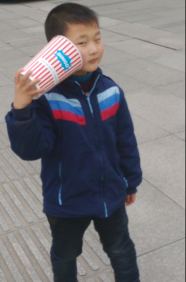点点一会儿拿着爆米花桶桶当电话机,和外公打电话,打完电话就说“对不起,我很忙,再见”。 点点一会儿又拿着爆米花桶桶当球踢,踢来踢去,滚来滚去,真好玩。