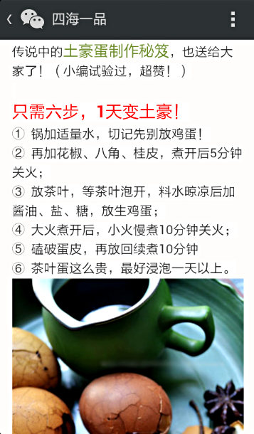 ![]() ![]() ![]() ![]() 昨天在朋友圈里看到同学分享的关于茶叶蛋的事情,我发现我奥特曼了,竟然这么出名的事件我都不知道呢!我赶紧问我老公知道茶叶蛋是怎么回事吗,他竟然也知道! 哇,真是一天不看新闻,马上就跟不上时代的脚步了! 而且,我发现,茶叶蛋这么高大上的食品,我竟然曾经拥有! 实在是太感动了,原来我也拥有过土豪的生活呀!我竟然不自知。 这不,为了紧跟潮流,我也来晒一晒我的茶叶蛋吧! ![]() ![]() ![]() ![]() 不了解的朋友,先看看茶叶蛋的典故吧!请看图! 如果不明白,请搜索“茶叶蛋”—— ![]() ![]() ![]() ![]() 好了,了解过茶叶蛋的典故后,请看看我的“高大上”的茶叶蛋是怎么诞生的吧! 这大概是我前年做的吧,当时照片什么的都拍好了,准备发上来晒一晒。 但由于我拖拉的个性,这些照片一直存在我的电脑里,一直没发上来给大家看。 没想到,迟迟不发这些照片,原来它们是在等待时机呀! 现在,它们的身份变得高大上了,这时再发它们出来,身份已经不一样啦! 太激动了! ![]() ![]() 首先,鸡蛋洗净,此时,它们只是普通的生鸡蛋而已。 ![]() 这是从家乡带来的特产茶叶。 而且是我家公珍藏已久的老茶叶,可谓“价值不菲”呀! ![]() 我先把茶叶碎来用,洗净,待用 ![]() 将鸡蛋用凉水煮开,待鸡蛋煮熟时用勺子将鸡蛋打破, 再在锅里放上水、茶叶、八角、花椒、盐、酱油等,再煮2分钟。 ![]() 用一个干净的容器,把鸡蛋捞进去,然后把茶叶汤倒入,继续浸泡。 我怕茶叶泡太久不好,所以我把茶叶滤出来了,可能要茶叶加进去效果更好吧。 ![]() 我做得不多,只浸泡了几天就取出来热一热,很快就把这几个茶叶蛋干掉了! ![]() 呵,颜色还不够深呀! 不过自己吃的,清淡点也不错,我总怕浸泡太久不好。 看外面卖的茶叶蛋都那么黑,每天都煮呀! ![]() 哈哈,我早就不记得这茶叶蛋的滋味了! 看哪一天,我再“奢侈”一把,再煮茶叶蛋来吃! 现在的土豪那么多,也不差我一个吧! ![]() ![]() ![]() 以上做法是很久以前做的,可能记得不太清了。刚才在微信看到这个做法,感觉这个做法更靠谱!