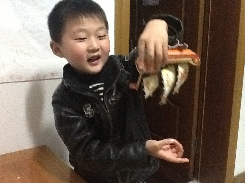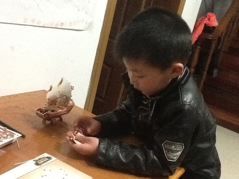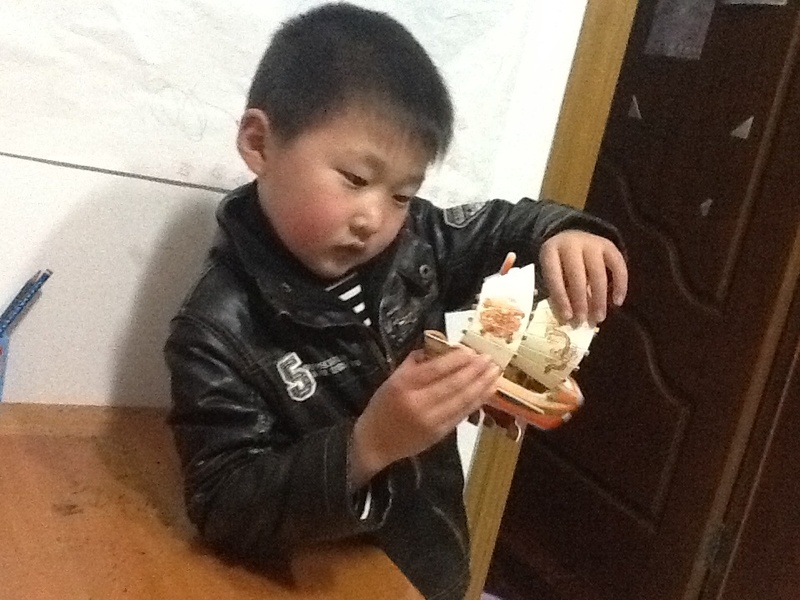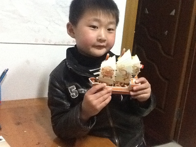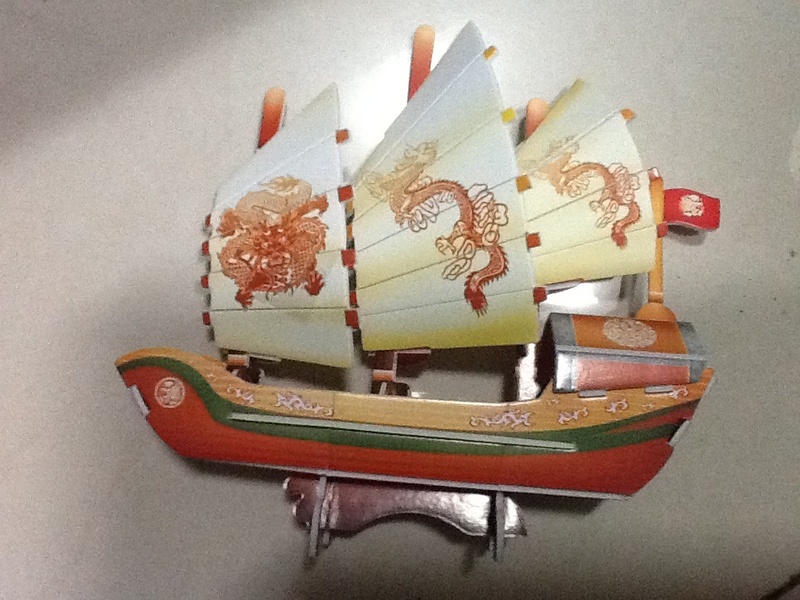 第一天我们拼了一个帆船,是我和点点一起拼装的,先拼底部,拼好以后再拼上面,就是甲板怎么拼上去我没有看懂,点点说甲板应该插在这个船的底部,这样才好,然后他就自己动手拼起来,很快就插好了。然后插上前面的一个雨棚,最后就把几面帆插上甲板这样一个帆船就做好了。