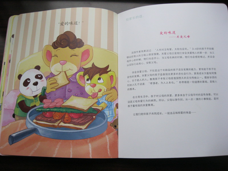 书名《爱的味道》 这本书是布奇乐乐园3-4岁成长绘本中的一期,由外研社儿童发展中心 编著 图书简介: 这本书讲述的是小主人公布奇早上起床之后,发现妈妈没有来叫他,也没有给他准备早餐,他开始以为妈妈和他捉迷藏,等到他在妈妈的房间的床上找到妈妈的时候,才发现,妈妈生病了,于是他就给妈妈拿了一大推的药,还拿了毛巾给妈妈敷上,他还想给妈妈做一个超级汉堡,莫莫来找布奇玩,不起没有去,因为他要给妈妈做超级汉堡,莫莫也来帮忙了。他们一起努力,做了一个超级汉堡,汉堡太大了,布奇想到用他的小鸭车运到了妈妈的房间爱你,妈妈看到这个超级汉堡,又惊又喜,脸上露出了开心的笑容,幸福妈妈要了一口,开心的嚼着,说着一个一个的原料:牛肉、西红柿、胡萝卜,还有一种特别的味道....那是什么味道呢?是爱的味道。 这是一本关于关爱父母的书,还是乐乐3岁多的时候读的,不过再重新读的时候,乐乐就学会了很多,那日我们一起吃我做的馒头三明治,乐乐就想到了这个,很开心的考我: “妈妈,这个三明治还有一种特殊的味道” “哦,那是什么味道?” “是爱的味道” “那妈妈怎么没有吃出来啊?” 乐乐明白了我的意思,就拿来一个馒头,学着我的样子,在上面抹上奶油、夹进去黄瓜、鸡蛋、火腿,然后交给我。 “妈妈,给你这个,你吃这个就会有爱的味道” 我接过乐乐做的三明治,仔细的品尝 “嗯,真的很特别,有黄瓜脆脆的,有火腿香香的,还有奶油甜甜的,还有还有一种特别的味道....” 乐乐和我一起说 “是爱的味道” 我的宝贝,你懂了吗?妈妈知道你是模仿着书中的做法,妈妈真是很希望你能真正的理解,这就是对父母的关爱。 还有一次,我很不舒服,回到家里就躺在了床上,乐乐来拉我要我和他一起玩,我就告诉乐乐“妈妈的头晕,很想躺一会,睡一觉,你能自己去玩吗?”你答应了,然后悄悄的离开,自己去客厅里碗,再也没有来打扰我,让我好好的睡了一觉。有的时候妈妈知道你是一个很善解人意的好宝贝。 在点滴生活中,我们对于孩子的一种爱,是可以得到孩子的回报,他们会像小大人一样,来关心你爱护你,其实这些都是他从我们的身上学到的,父母就是要给孩子这样的表率,这就是平时的言传身教。当我们去用心的关心爱护我们身边的人的时候,孩子岁虽小但是他们是能够模仿和感受的,要培养孩子站到他人的立场上感受。当我们的宝贝能够作出任何关心关爱我们的事情的时候,要给孩子充分的肯定和赞美,让他们知道这样关心父母是对的,从而会同情别人,变成一个乐于助人的孩子的。 孩子的成长需要学的东西很多,包括如何爱父母,爱他人,如何去关心被人关爱别人,当我们陪伴孩子一同成长的时候,我们付出爱,也会收获爱。 本作品未经作者许可不得转载,转载请征求作者意见。擅自转载使用,将保留追究其法律责任的权利! 评分记录