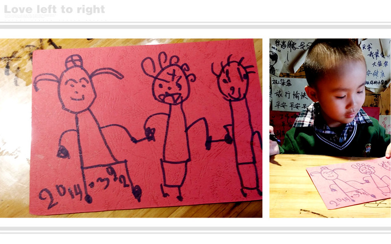 谦最后完成的画, 从左侧向右分别是妈妈,谦和爸爸,还写下来日期。